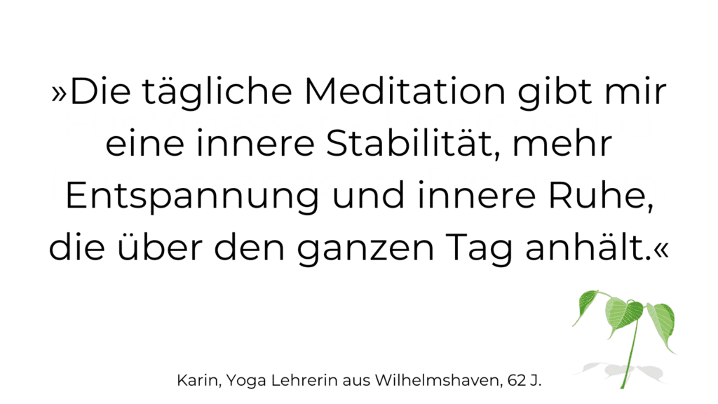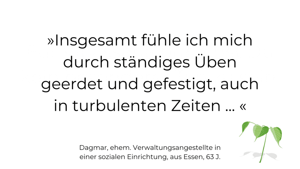 “Die tägliche Meditation gibt mir, genau so wie sie ist, eine innere Stabilität, mehr Entspannung und innere Ruhe, die über den ganzen Tag anhält. Ich neige zu Muskelanspannung bei allen Erlebnissen und das führt logischerweise zu Muskelschmerzen die sich dadurch stark reduzieren. Ich bleibe in meiner Ruhe, und wenn ich mich mal aufrege, finde ich sehr schnell wieder zu mir zurück. Ist doch perfekt ! Danke dafür. Bin schon gespannt auf morgen. Von mir aus muss nichts verändert werden.”